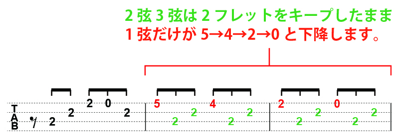 演奏のポイントはDコードを押さえた(キープした)状態で1弦が5→4→2→0と下降してくる所です。